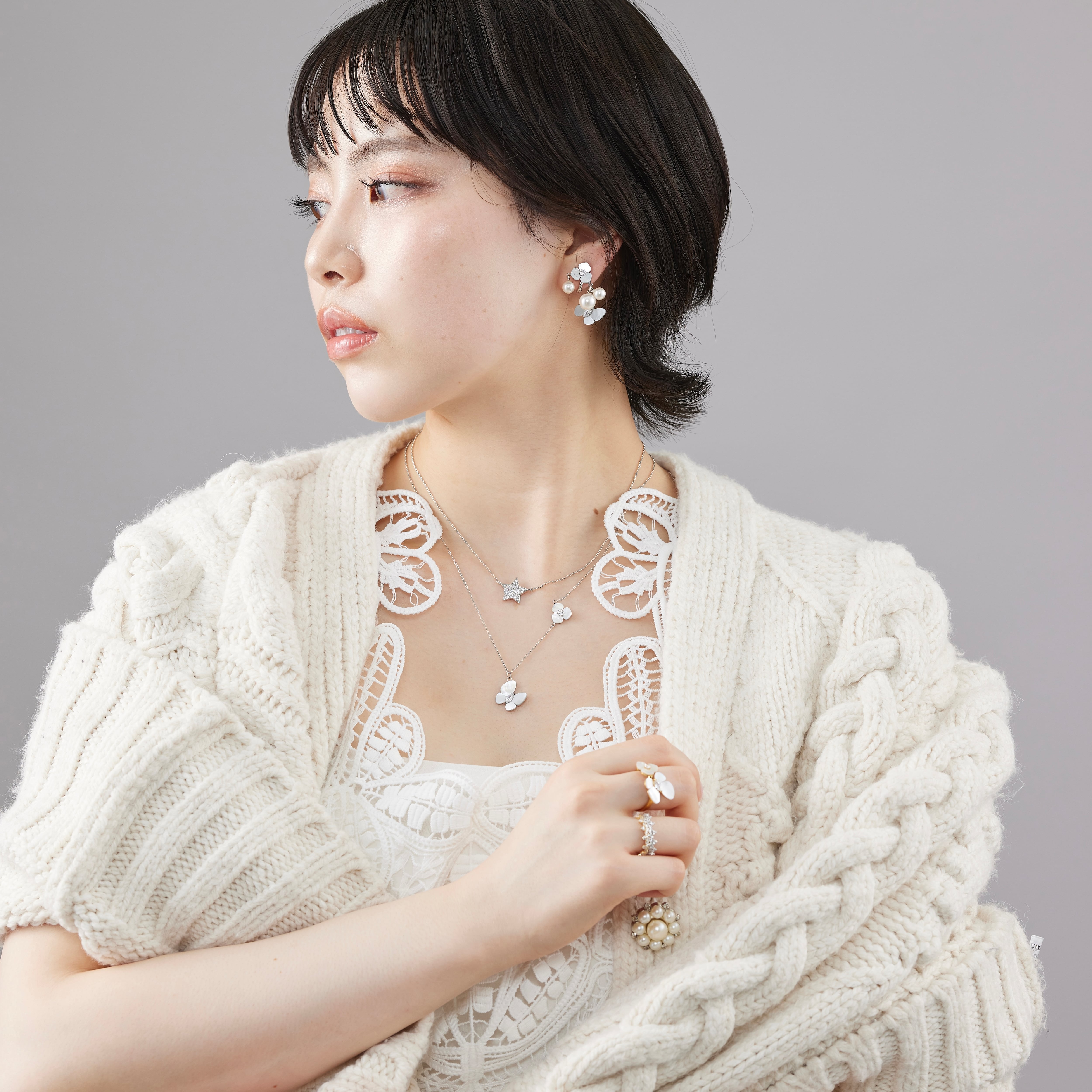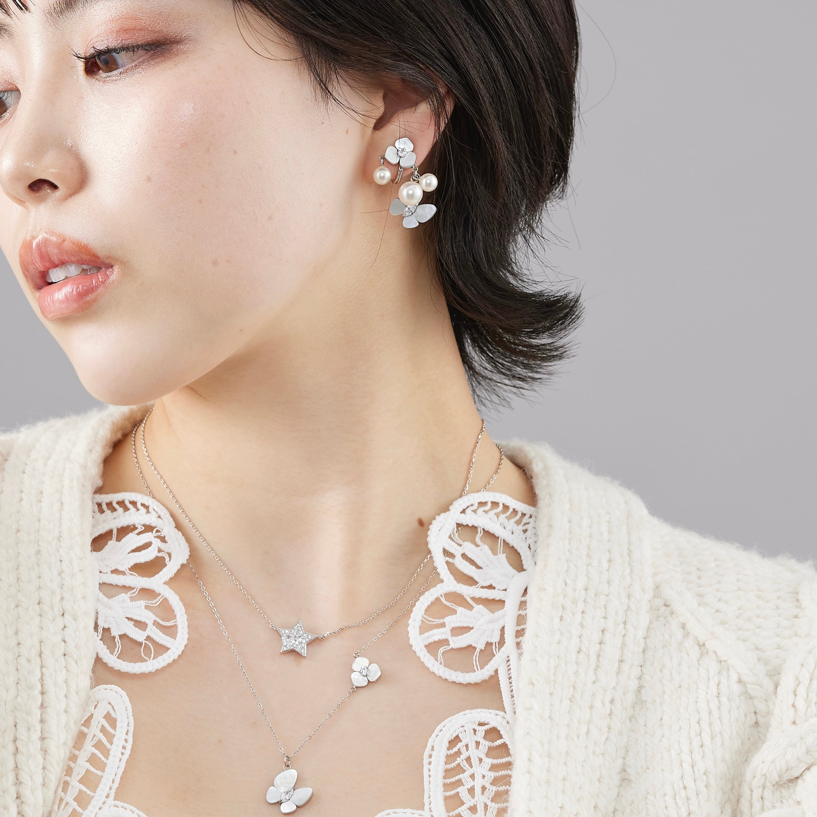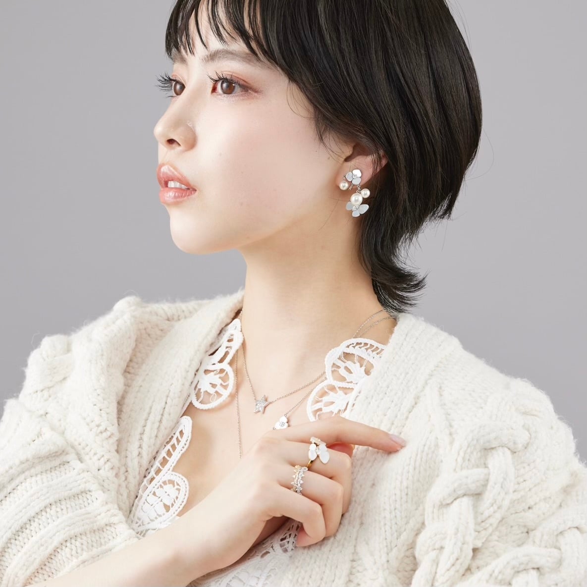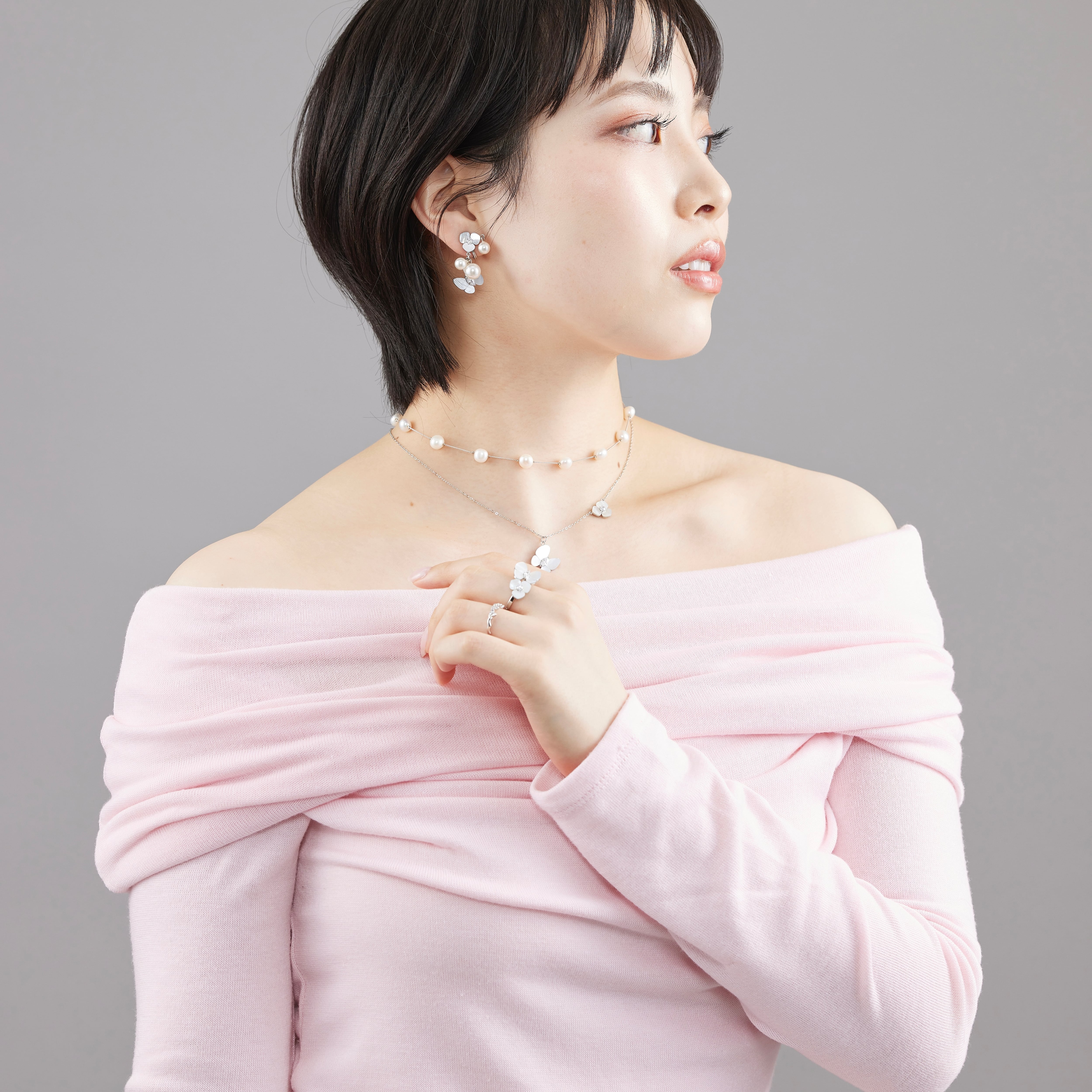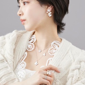 やわらかに光を受けてきらめくホワイトシェルで作られた蝶と花のモチーフは、上品さとピュアでロマンチックな表情が魅力的。