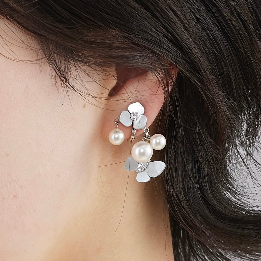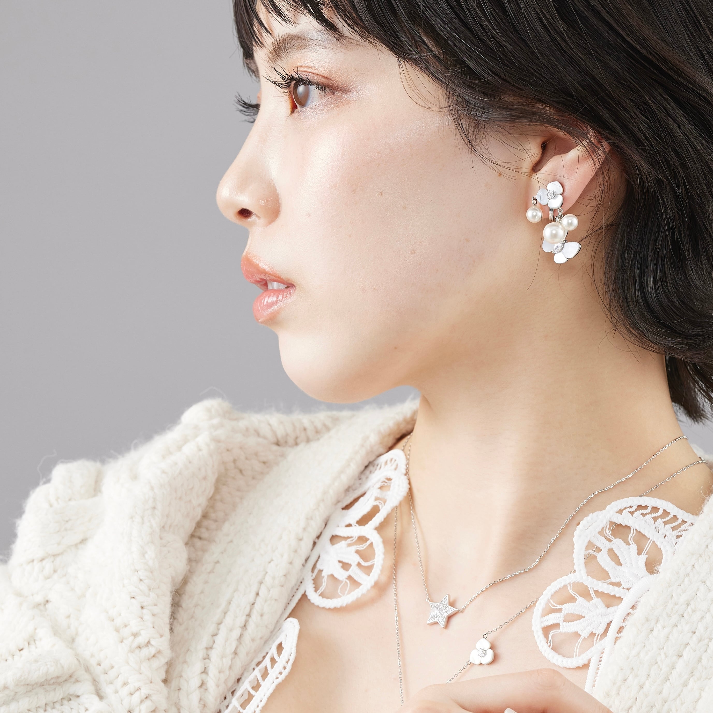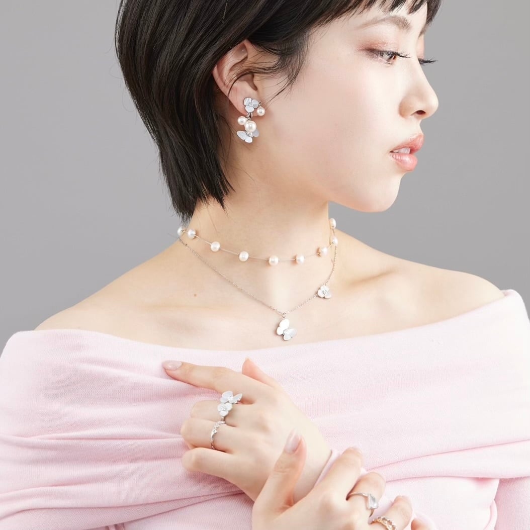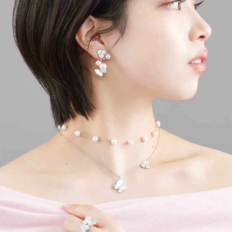 やわらかに光を受けてきらめくホワイトシェルで作られた蝶と花のモチーフは、上品さとピュアでロマンチックな表情が魅力的。