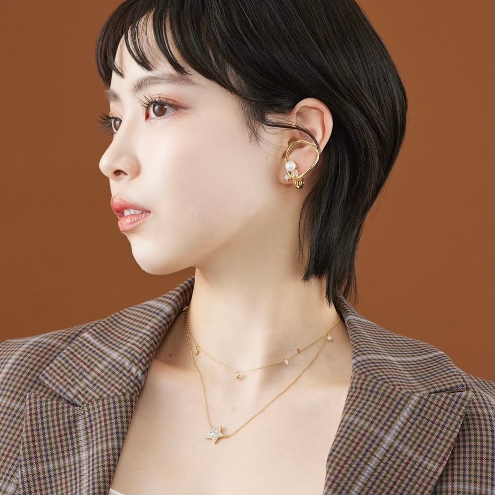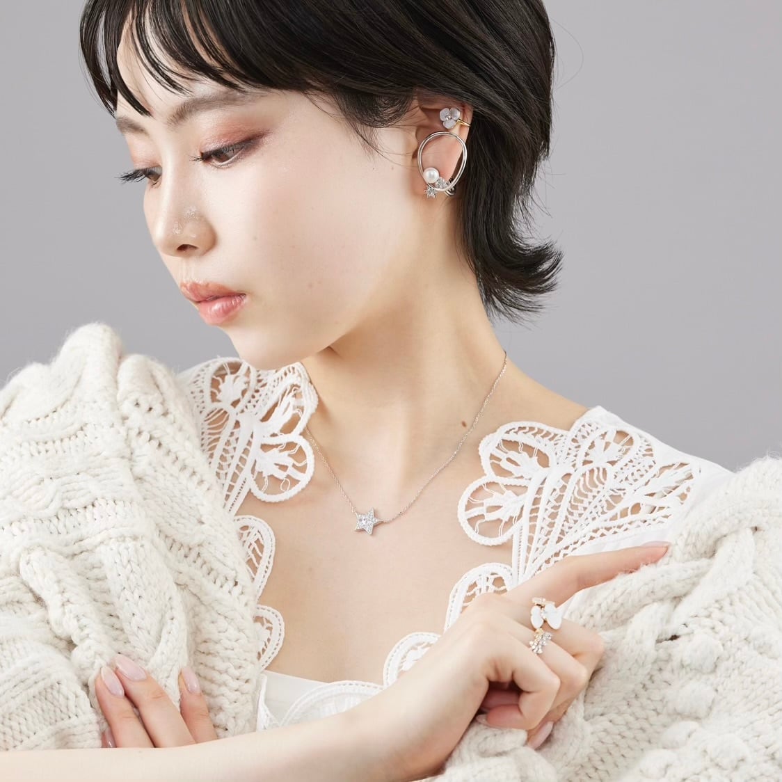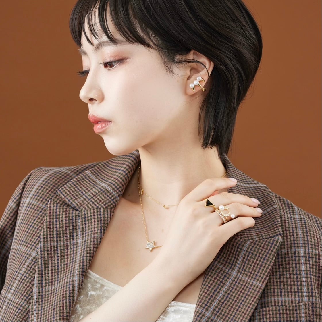 ロマンチックなモチーフでありながら、エッジの効いたラインが顔まわりや胸元を引き締め、スタイル全体をモードにもカジュアルにも導きます。