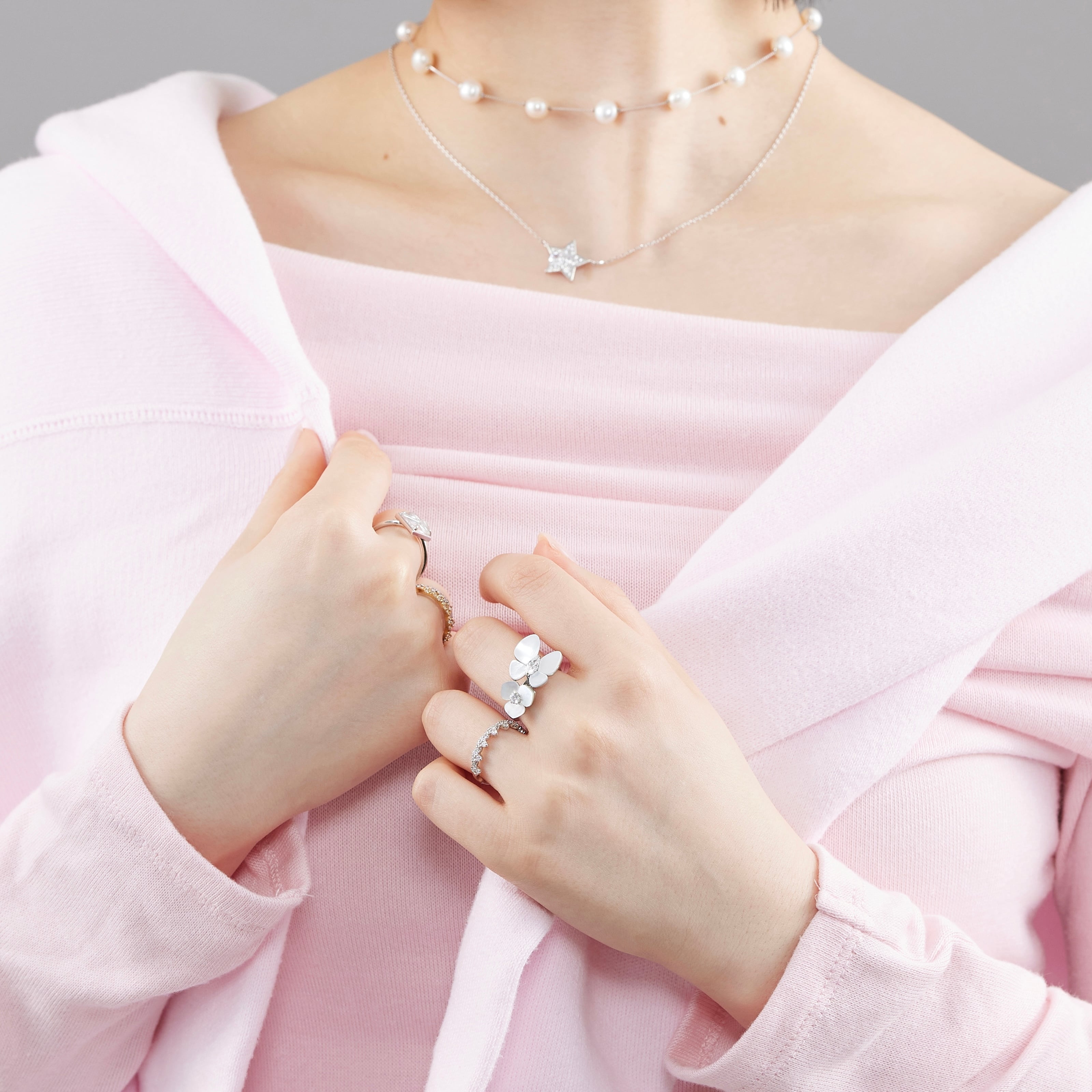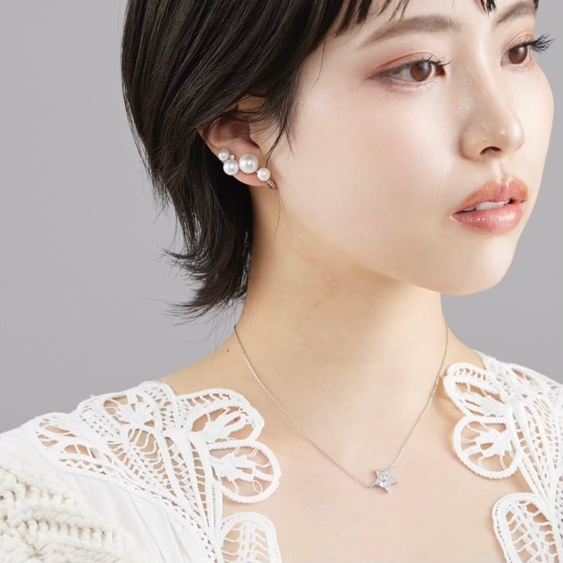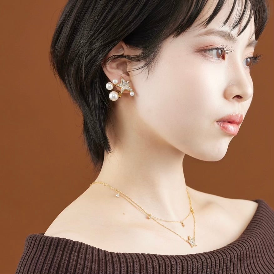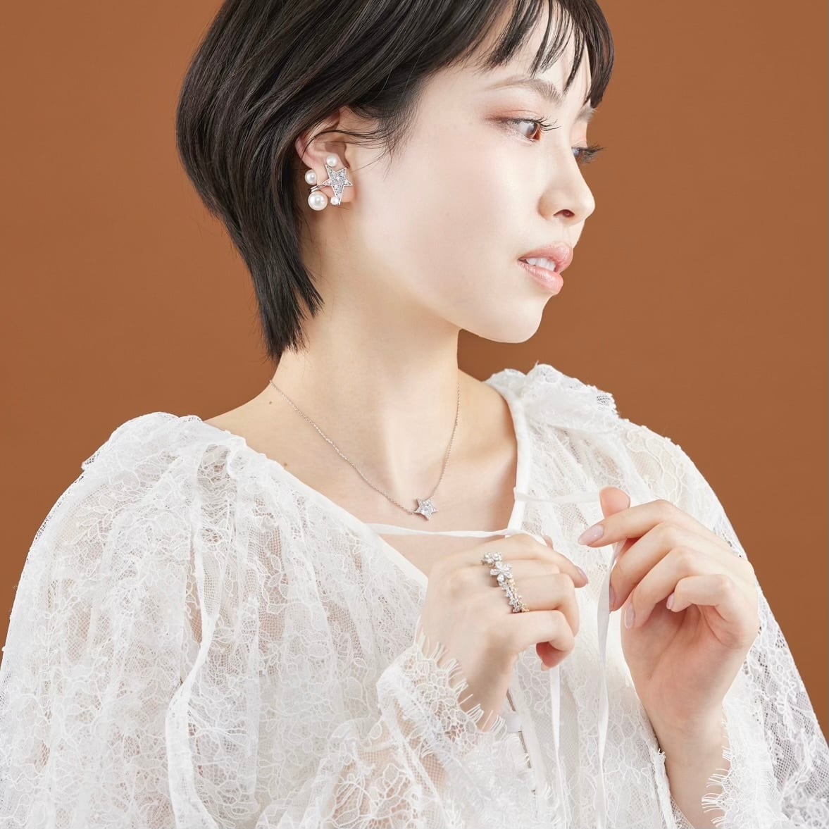 ロマンチックなモチーフでありながら、エッジの効いたラインが顔まわりや胸元を引き締め、スタイル全体をモードにもカジュアルにも導きます。