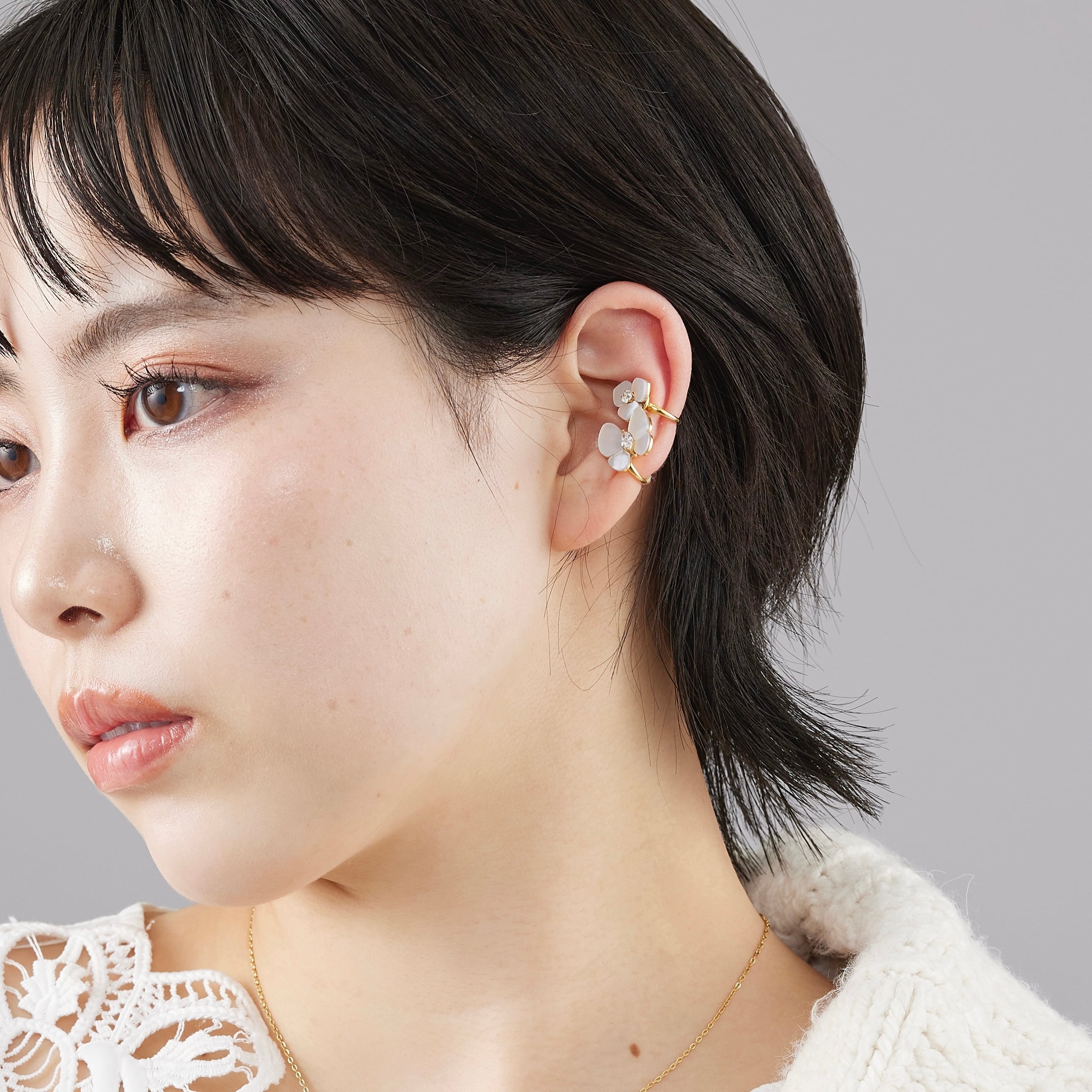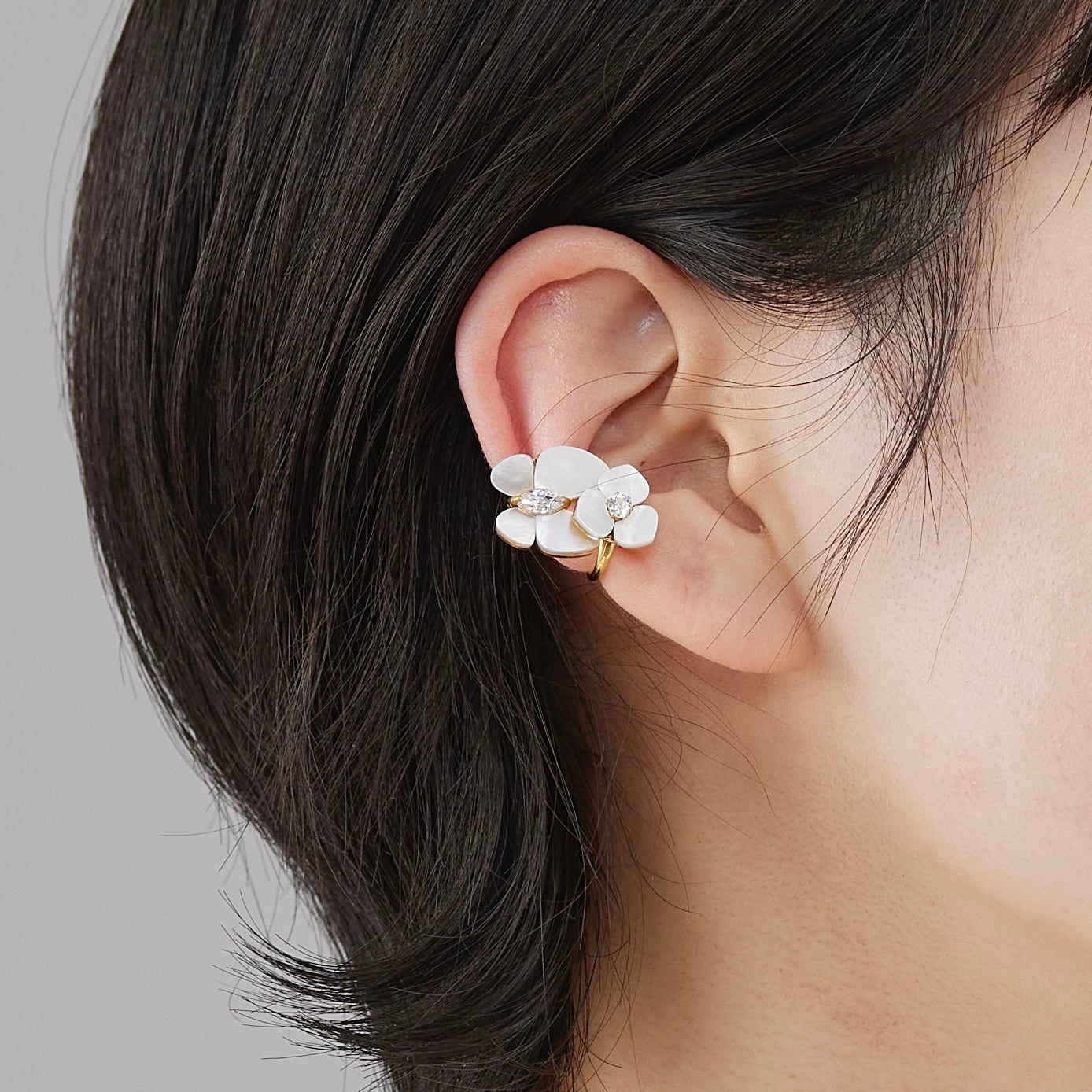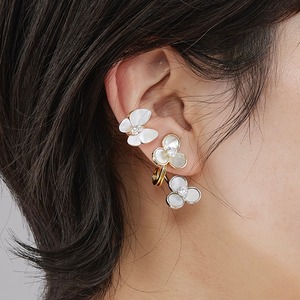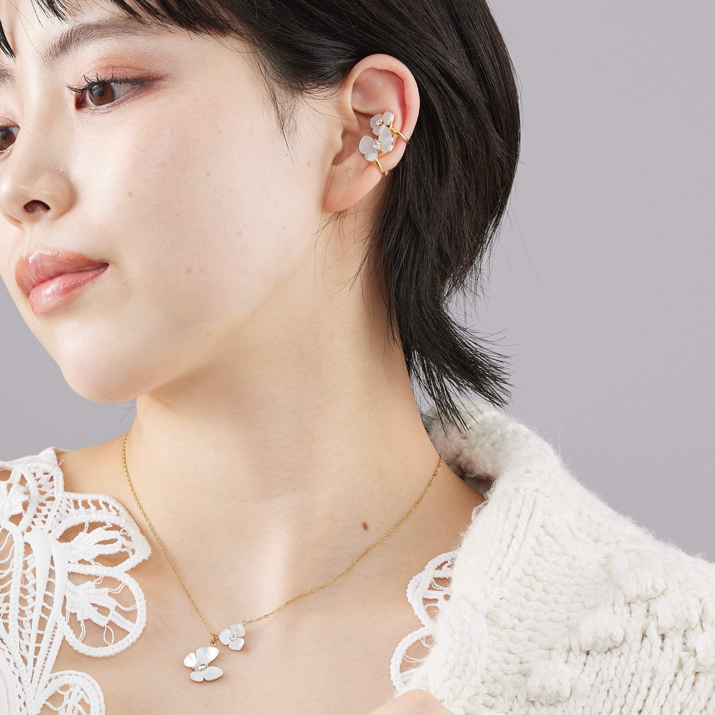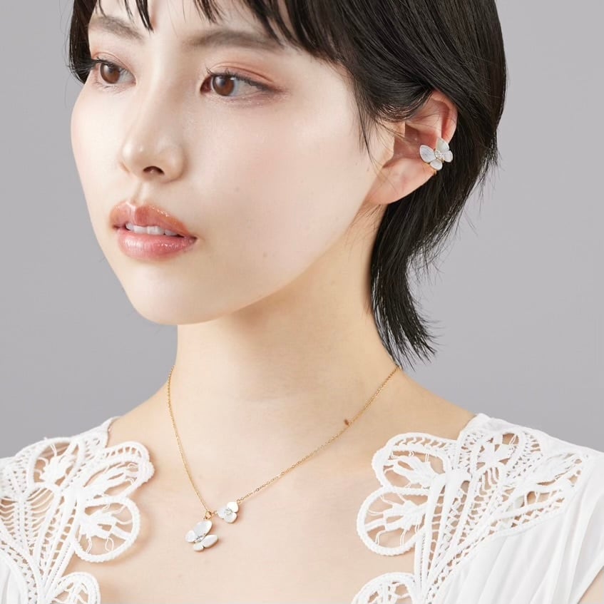 やわらかに光を受けてきらめくホワイトシェルで作られた蝶と花のモチーフは、上品さとピュアでロマンチックな表情が魅力的。