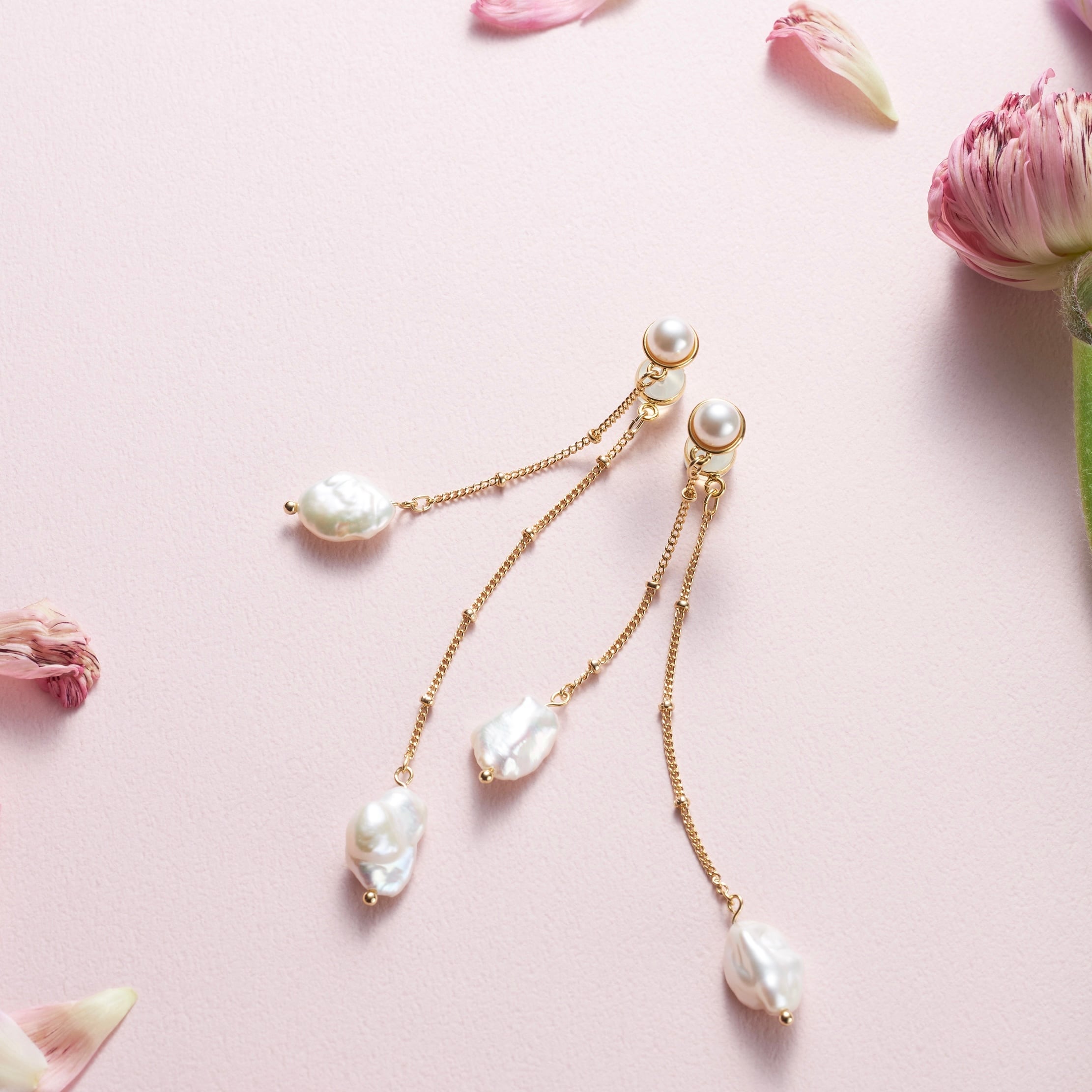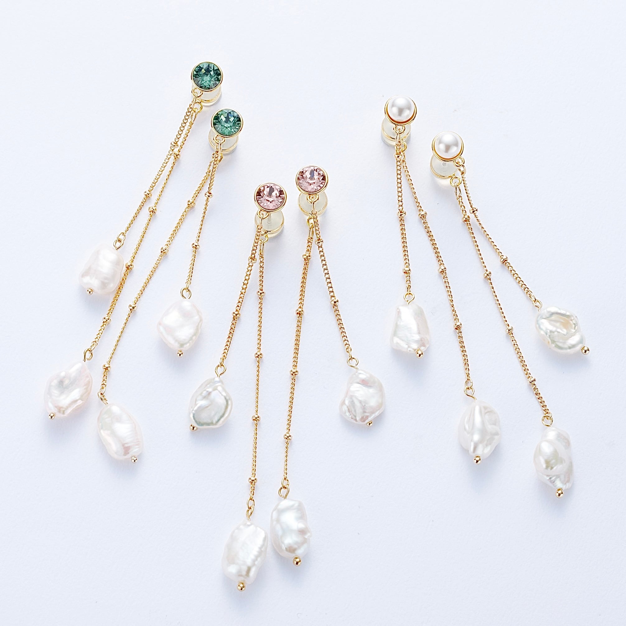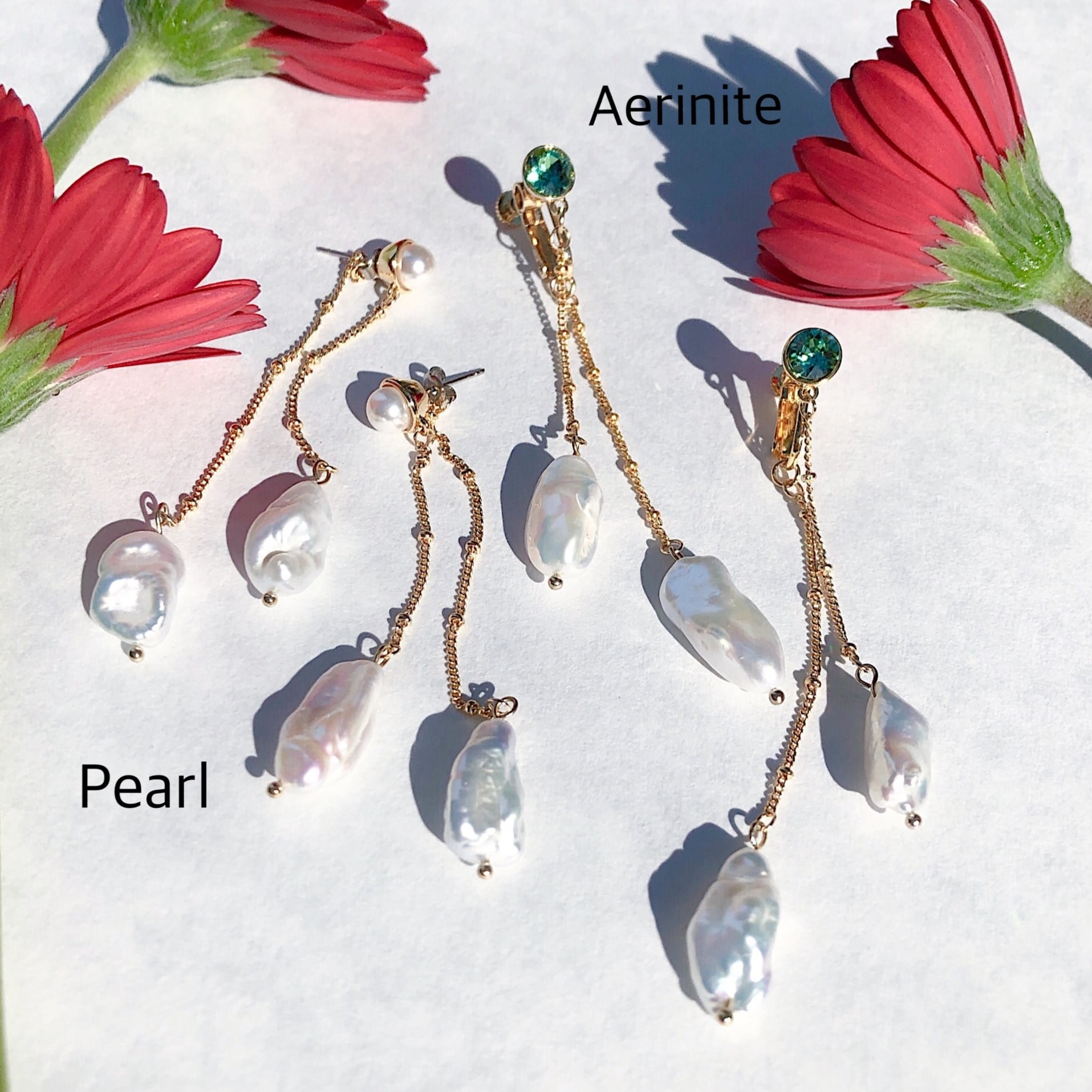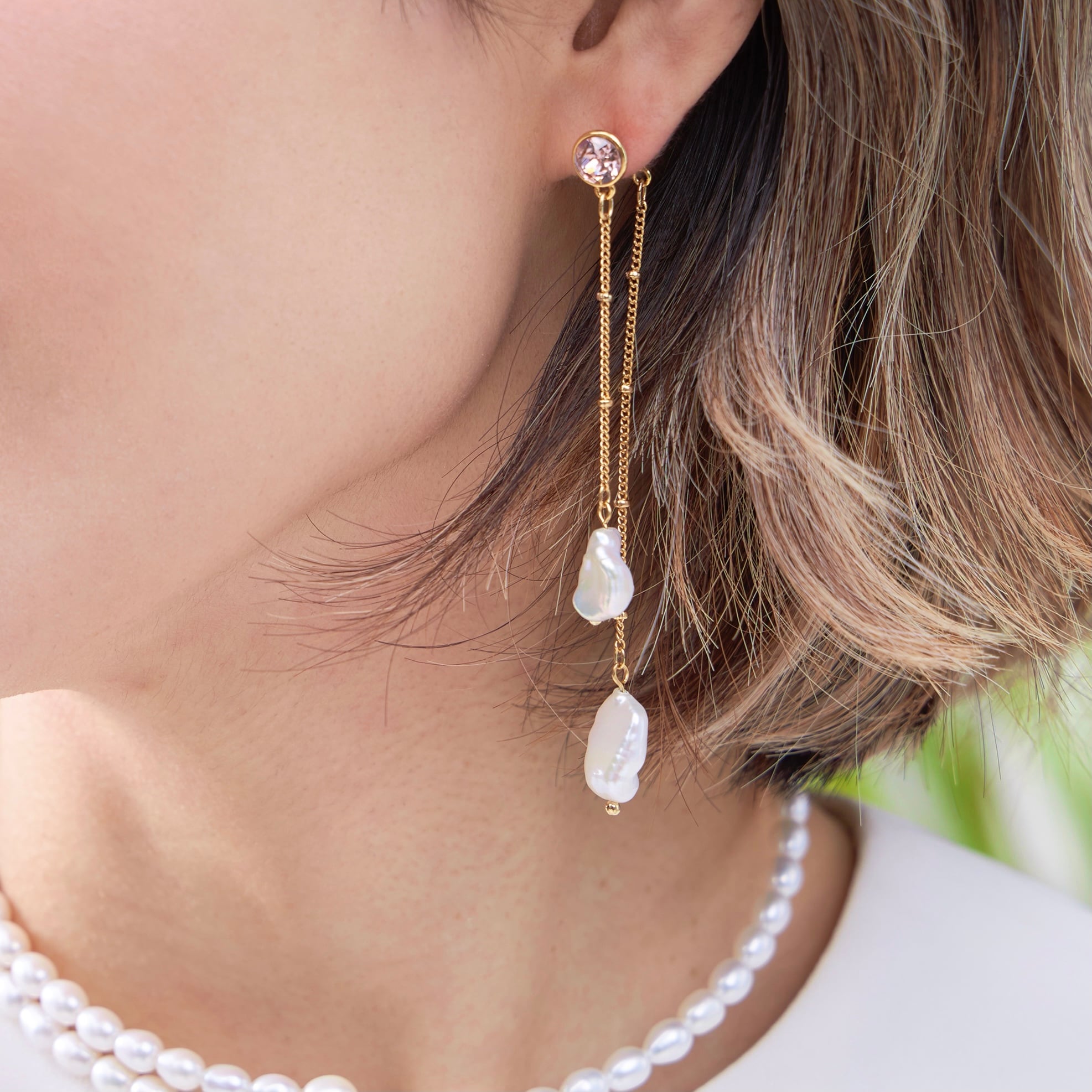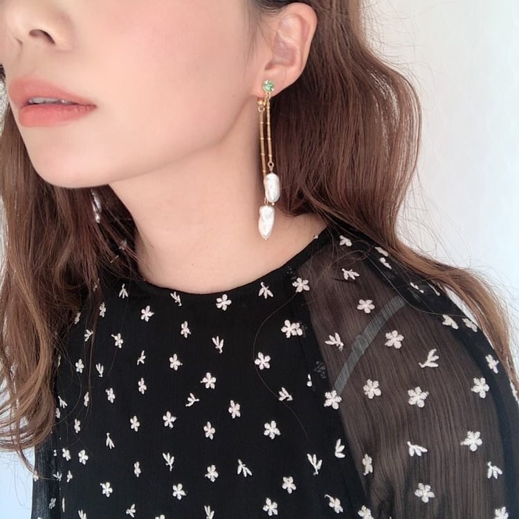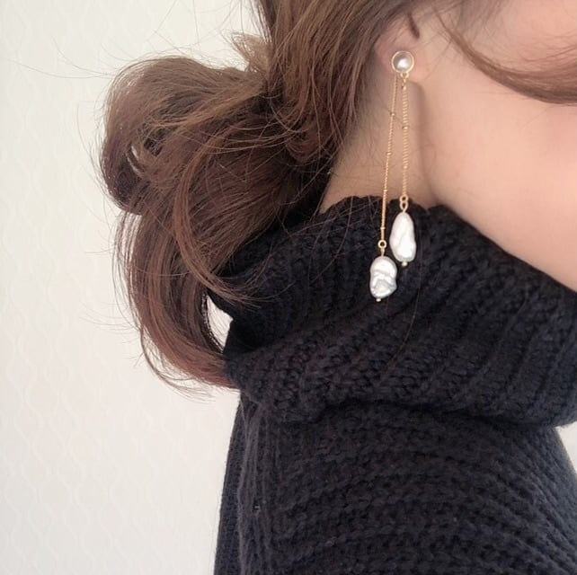 長さの違う淡水パールが軽やかに揺れるロングタイプのデザイン。