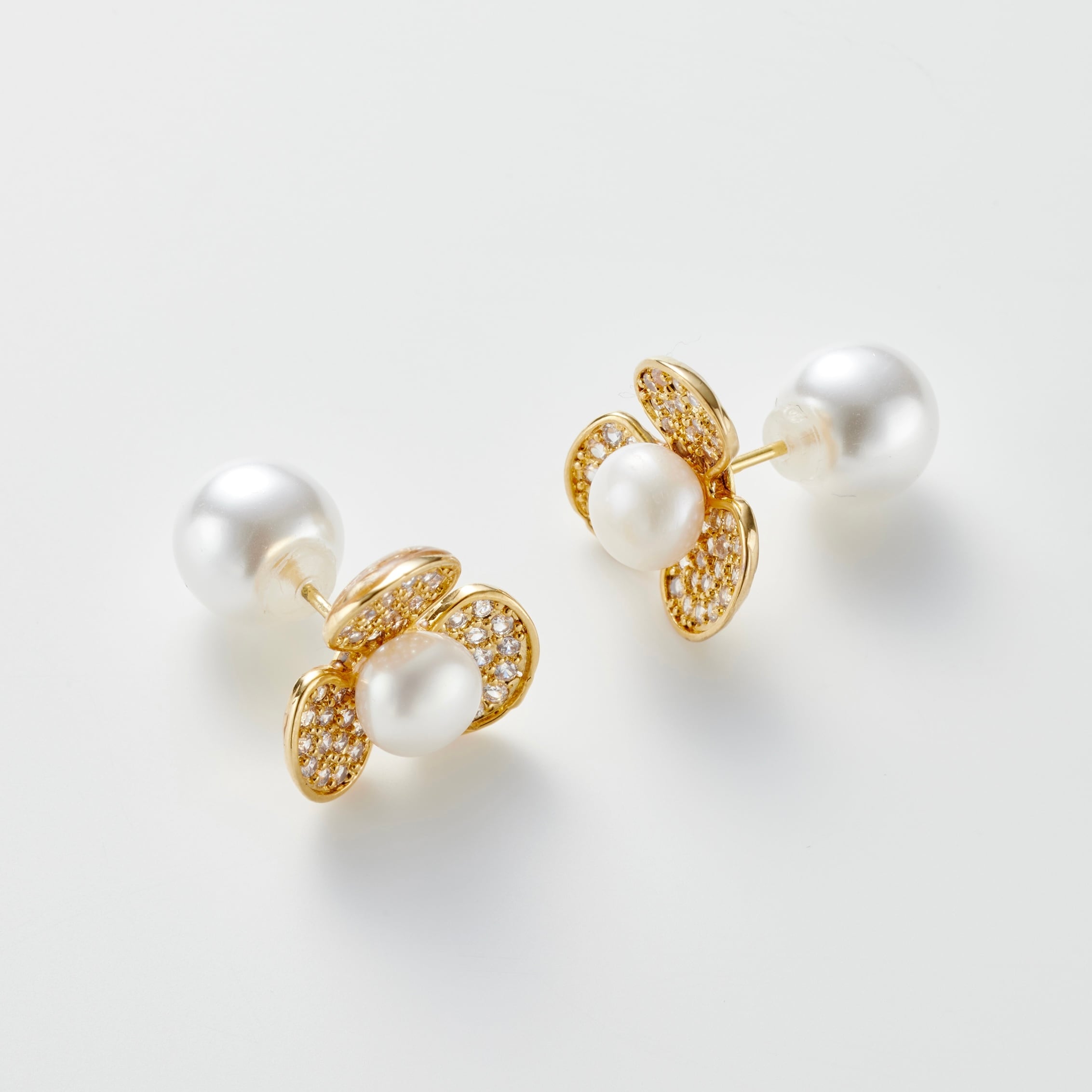 ジルコニア煌めく花びらに、ワンポイントとなる淡水パールが際立つ存在感。